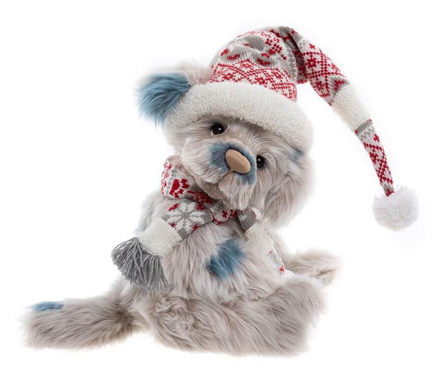 Meet Puddletown, a heart-melting little pup made from unbelievably soft plush. His fluffy grey coat, touched with hints of blue, gives him a uniquely lovable look that stands. Ready for frosty days, he’s bundled in a cheerful red, white, and grey knitted hat with a matching scarf that adds to his winter charm. Fully jointed and carefully hand-finished, Puddletown shows off finely detailed paw pads that speak to his exceptional craftsmanship. And, of course, his adorable “Who, me?” expression is the finishing touch that makes him utterly irresistible. Suitable for ages 3 years+. Puppy height: 38cm/15”/12.7 Bear Paws.